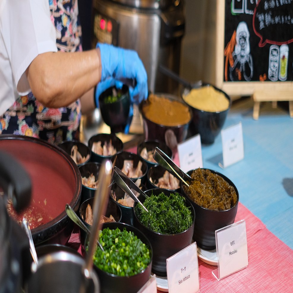 もずく・アーサ・ネギ・巻麩など好きな具材を入れてもらえます。